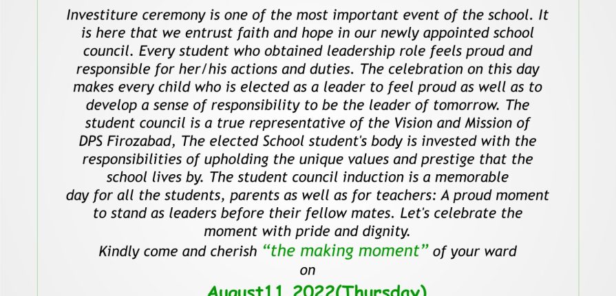 “If your actions inspire others to dream more, learn more, do more and be come more, you are a leader.” Dear Madam/Sir We take immense pleasure in inviting you to attend the “Investiture Ceremony Session 2022-23” Organized by our school Investiture ceremony is one of the most important event of the school. It is here that we entrust faith and
